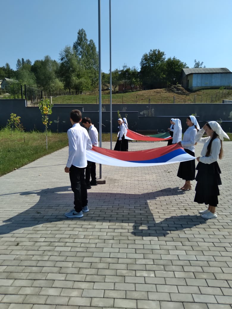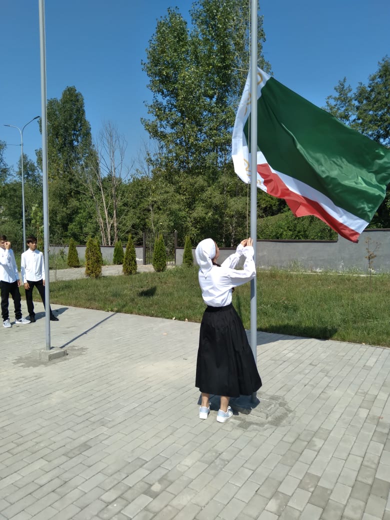 Торжественное мероприятие, посвящённое началу нового учебного 2022-2023 года, началось с церемонии поднятия Государственных флагов РФ и ЧР и исполнения Государственных гимнов РФ и ЧР.