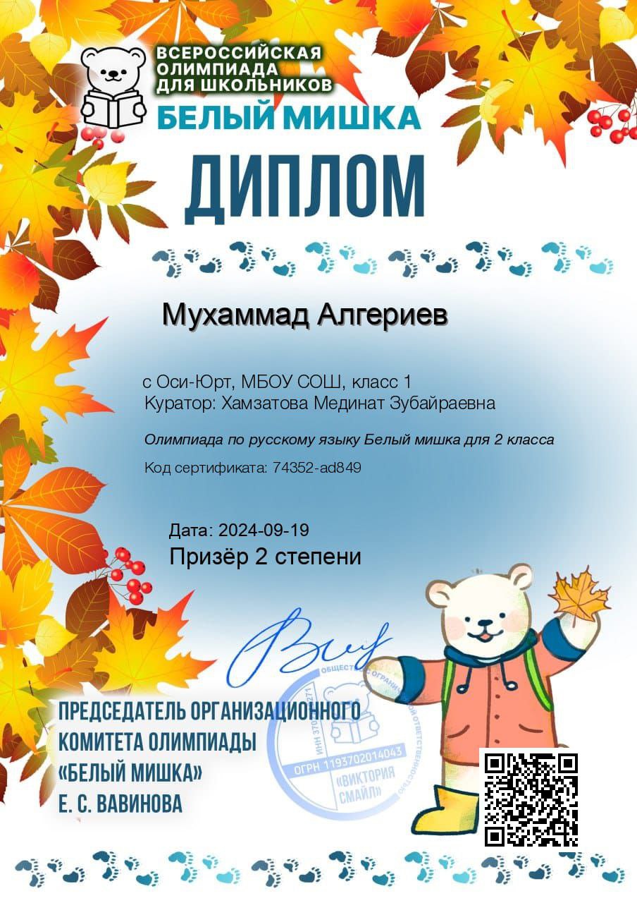 19.09.2024В рамках исполнения федеральных проектов " Цифровая школа", "Успех каждого ребёнка" учащиеся начальных классов приняли участие во Всероссийской олимпиаде "Белый мишка". Олимпиада проходит в дистанционном формате. Дипломы соответствуют требованиям Министерства просвещения РФ и имеют официальный статус.